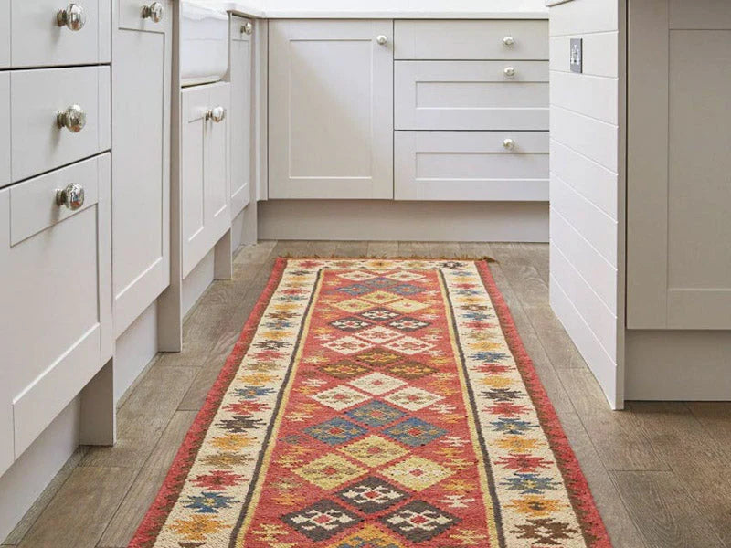 Elige un tapete de un tamaño lo suficientemente largo para que cubra el pasillo entero de la cocina.
